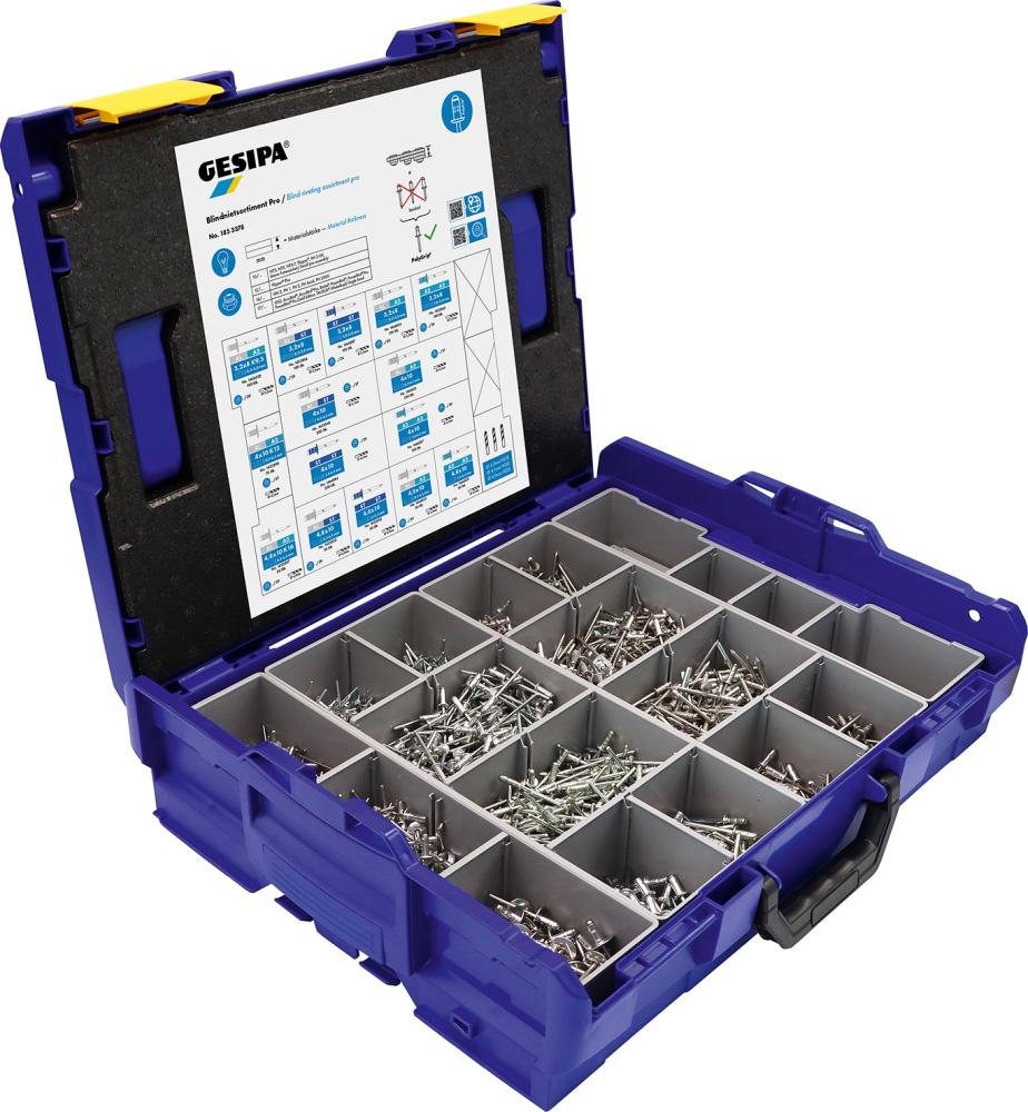 Blindniet-Sortiment PRO, 1578-teilig • PolyGrip®-Blindniete in 15 Abmessungen • Zum Verarbeiten von Blindnieten Ø 3,2-4,8 mm • Blindniete aus Aluminium, Edelstahl (A2), Stahl (STST) und Aluminium-Stahl (ALST) Lieferung: In L-Boxx. Inhalt: 100 PolyGrip®-Blindniete Alu/Niro Grosskopf 3,2 x 8 K 9,5 75 PolyGrip®-Blindniete Alu/Niro Grosskopf 4 x 10 K 12 50 PolyGrip®-Blindniete Alu/Niro Grosskopf 4,8 x 10 K 16 100 PolyGrip®-Blindniete Alu/Stahl Flachrundkopf 3,2 x 8 100 PolyGrip®-Blindniete Stahl/Stahl Flachrundkopf 3,2 x 8 100 PolyGrip®-Blindniete Alu/Niro Flachrundkopf 3,2 x 8 100 PolyGrip®-Blindniete A2-Edelstahl Flachrundkopf 3,2 x 8 200 PolyGrip®-Blindniete Alu/Stahl Flachrundkopf 4 x 10 200 PolyGrip®-Blindniete Stahl/Stahl Flachrundkopf 4 x 10 200 PolyGrip®-Blindniete Alu/Niro Flachrundkopf 4 x 10 150 PolyGrip®-Blindniete A2-Edelstahl Flachrundkopf 4 x 10  50 PolyGrip®-Blindniete Alu/Stahl Flachrundkopf 4,8 x 10 50 PolyGrip®-Blindniete Stahl/Stahl Flachrundkopf 4,8 x 10 50 PolyGrip®-Blindniete Alu/Niro Flachrundkopf 4,8 x 10 50 PolyGrip®-Blindniete A2-Edelstahl Flachrundkopf 4,8 x 15 3 HSS Metall-Spiralbohrer Ø 3,3; 4,1; 4,9 mm Hersteller: GESIPA Blindniettechnik GmbH, Nordendstr. 13-39, 64546 Mörfelden-Walldorf, DE, +49 6105 962-0, info@gesipa.com