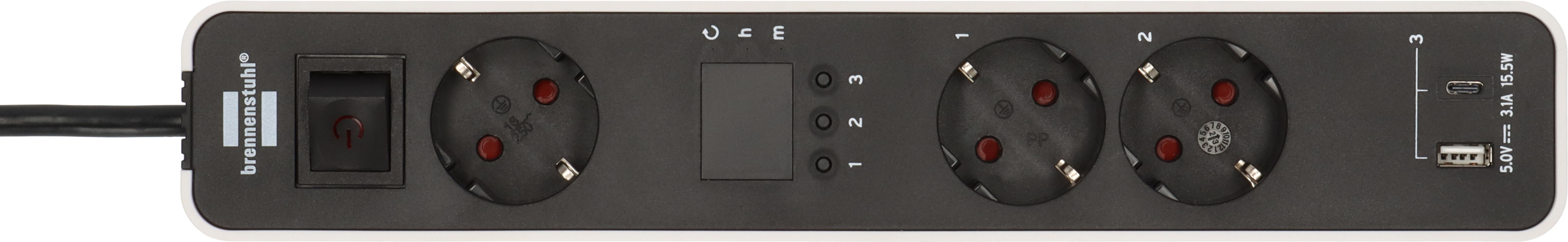 Die Ecolor Steckdosenleiste 3-fach mit Countdown Timer und USB A und C von Brennenstuhl bietet eine permanente Schutzkontakt-Steckdose, zwei schaltbare Schutzkontakt-Steckdosen (max. 230V/16A, 3680W) mit erhöhtem Berührungsschutz und einen USB A und USB C Ladeanschluss (max. 5V/3.10A, 15.5W). Die zwei programmierbaren Steckdosen sowie die USB-Anschlüsse können dauerhaft entweder aktiviert oder deaktiviert werden, indem sie entsprechend eingestellt werden. Darüber hinaus bieten die drei voneinander unabhängigen Timer flexible Optionen, darunter 11 wählbare Timer-Intervalle von 15 Minuten bis 24 Stunden. Zudem überzeugt die Mehrfachsteckdose durch folgende Eigenschaften: