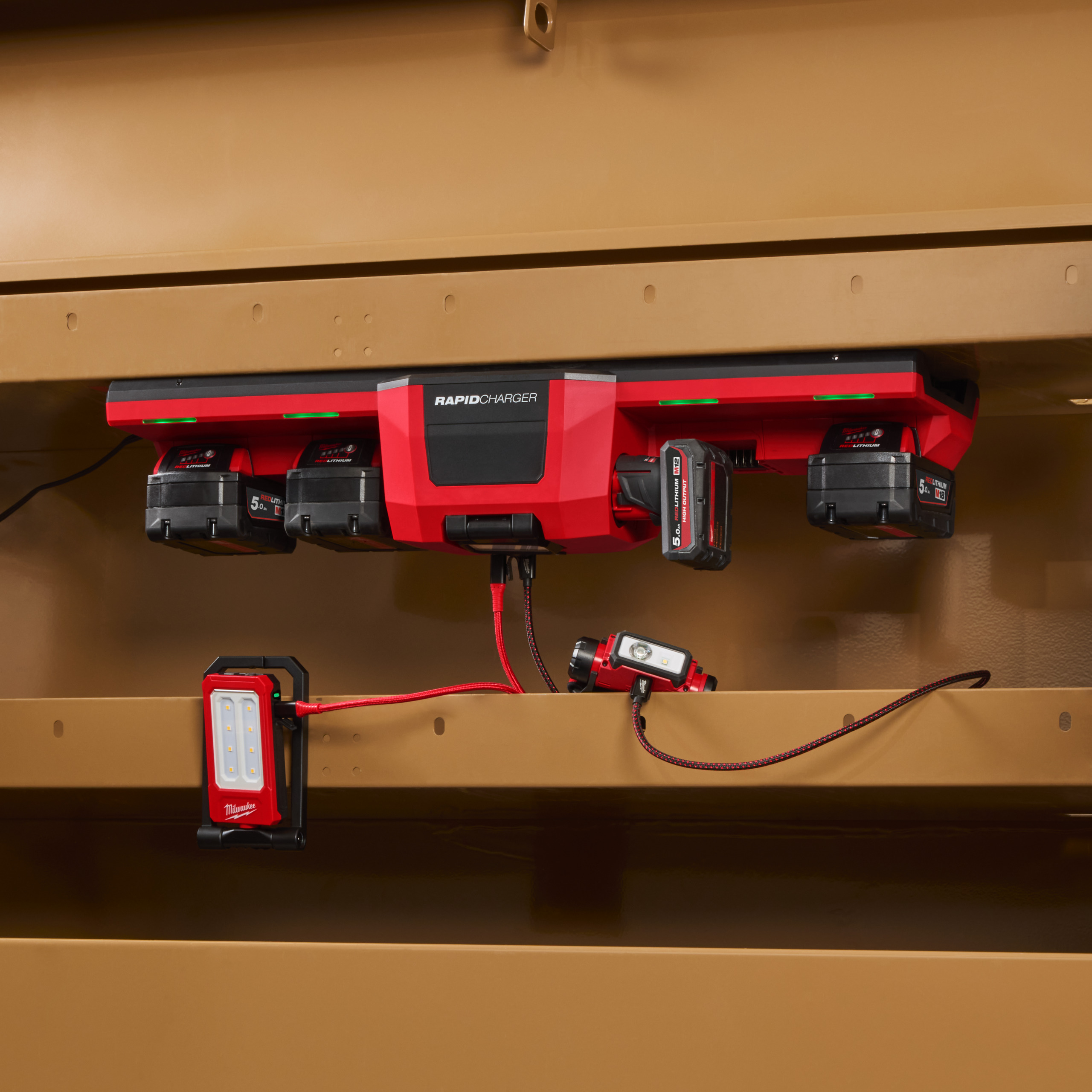 - Gleichzeitiges Laden von zwei Akkus mit Schnellladefunktion für M18™ und M12™, dann automatisches Umschalten auf die nächsten beiden Akkus
