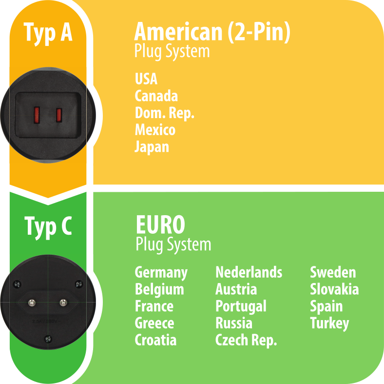 - Von USA in Ländern mit Euro-Stecksystem (Bitte beachten Sie, dass es manchmal in den verschiedenen Ländern mehrere Stecksysteme gibt und Brennenstuhl keine Garantie dafür übernimmt, dass der Reisestecker für alle Stecksysteme in einem Land passend ist)