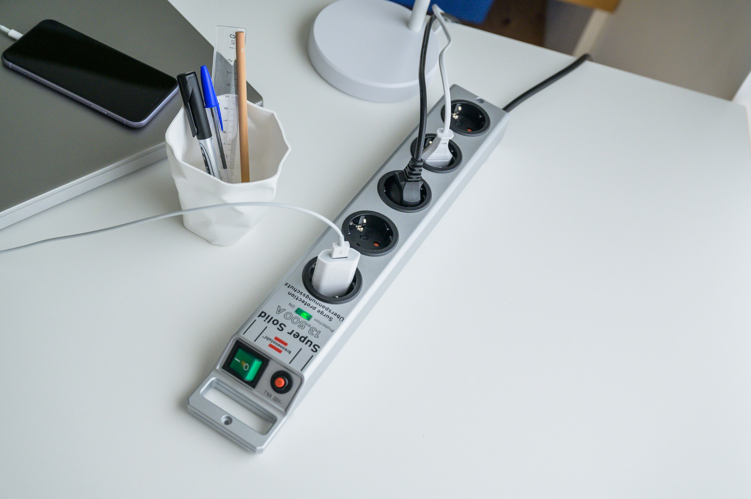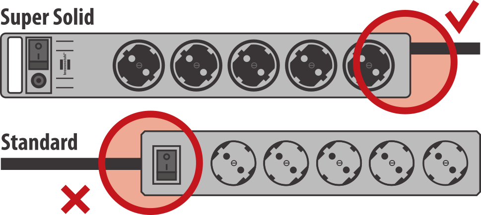 Die Super-Solid 5er Mehrfach-Steckdosenleiste von Brennenstuhl in der Farbe silber und 2,5m Kabel besticht durch ihre Qualität und Sicherheit in allen Bereichen. Durch einen besonderen Kabeleingang gegenüber dem Schalter ist die Bedienung dieser Steckerleiste besonders erleichtert z.B. unter dem Schreibtisch. Sie verfügt nicht nur über einen erhöhten Berührungsschutz, sondern überzeugt außerdem durch folgende Eigenschaften: